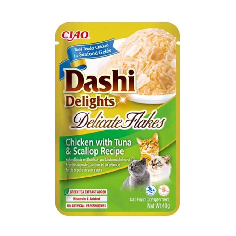 دلّل قطك مع وجبة فاخرة من إينابا ديلايت دشي – وصفة تجمع بين شرائح الدجاج، التونة، وقطع الإسكالوب في مرق خفيف شهي يعزز الترطيب الطبيعي ويجذب حتى القطط الانتقائية.